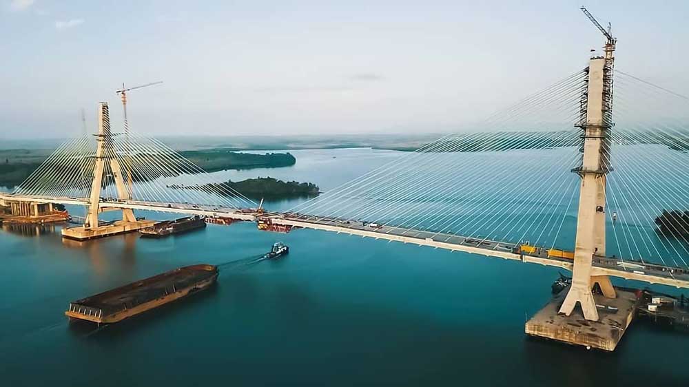 斜拉橋位于印尼東加里曼丹?。ㄆ帕_洲),連接巴朗島和巴里帕潘地區(qū)的坦帕東。該橋主跨402m,為印尼同類混凝土橋梁中最長跨度橋梁,全長804m,塔柱距承臺頂高113m。