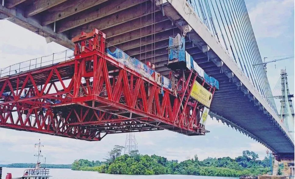 斜拉橋位于印尼東加里曼丹?。ㄆ帕_洲),連接巴朗島和巴里帕潘地區(qū)的坦帕東。該橋主跨402m,為印尼同類混凝土橋梁中最長跨度橋梁,全長804m,塔柱距承臺頂高113m。