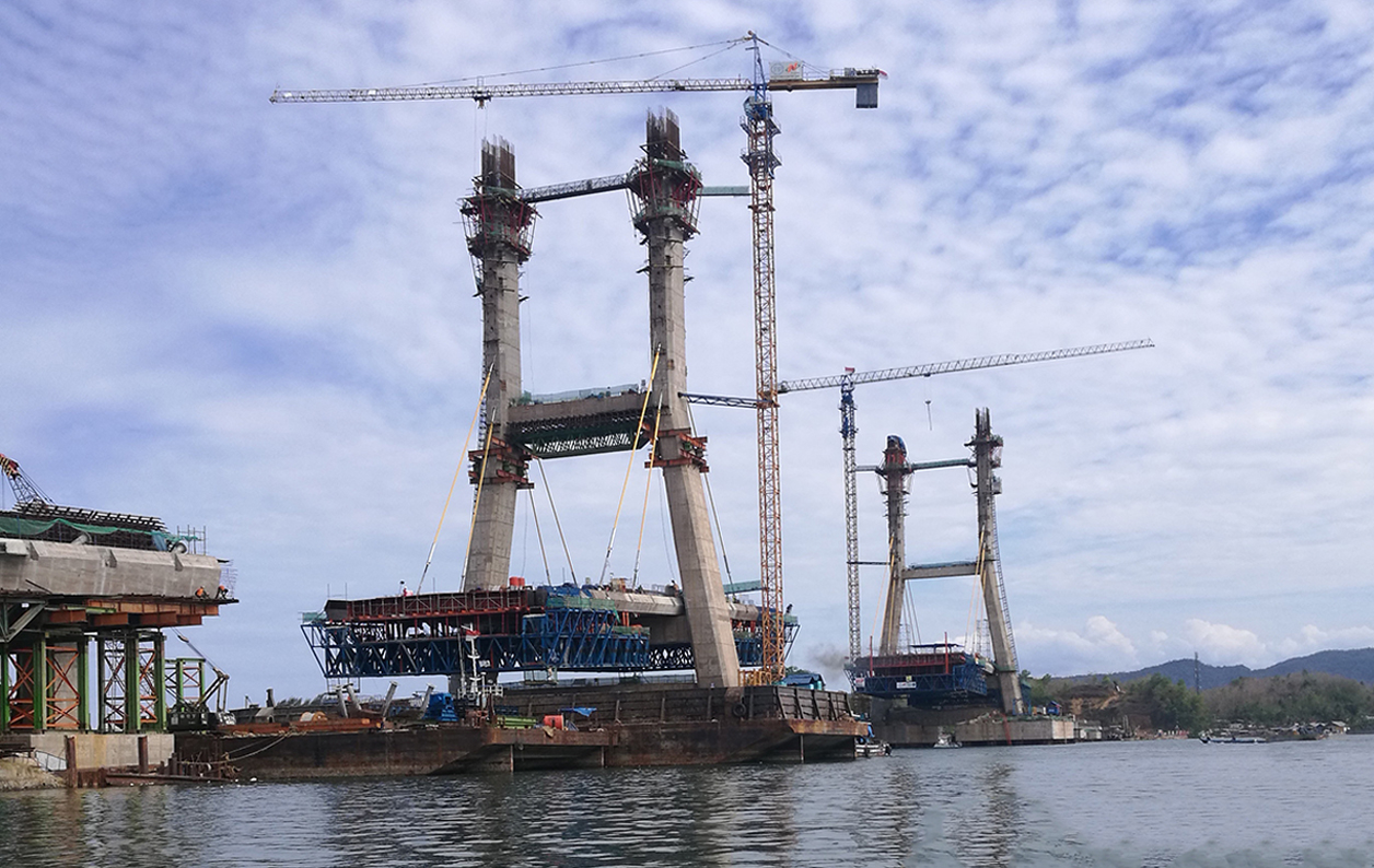 肯達(dá)里斜拉橋位于印尼蘇拉威西省,橋梁全長(zhǎng)474.08m,主跨388m,雙塔高約78.35m,預(yù)應(yīng)力混凝土橋面寬25m,采用雙向雙車道公路和兩條人行道。