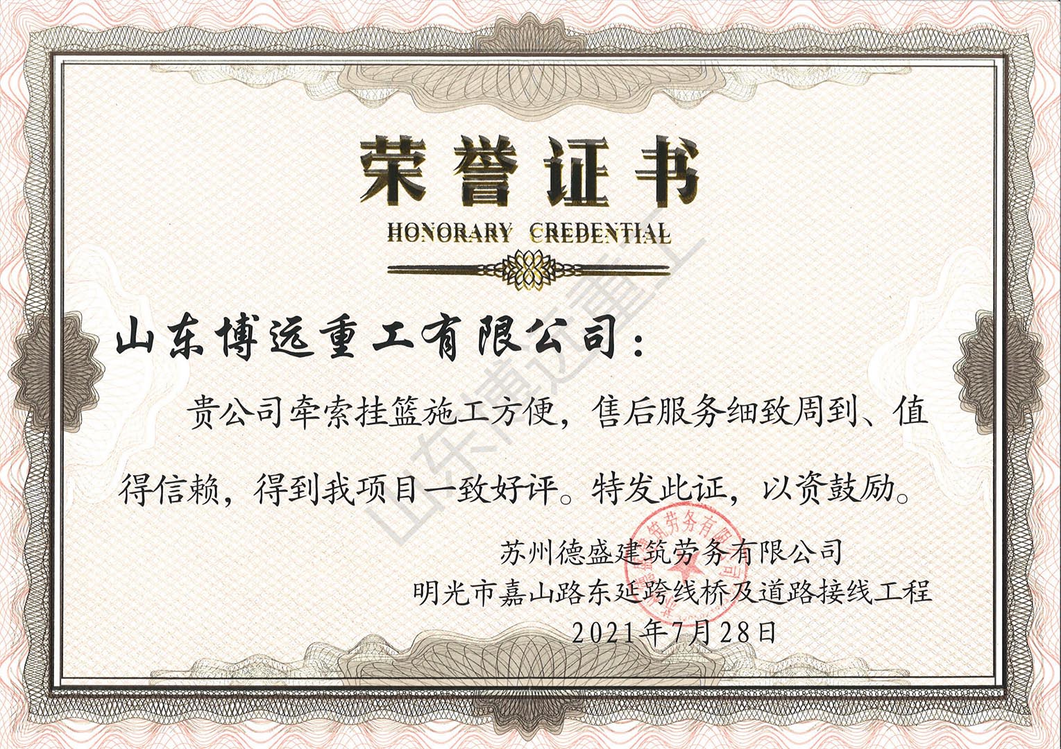 明光市嘉山路東延跨線橋及道路接線工程牽索掛籃榮譽(yù)證書(shū)